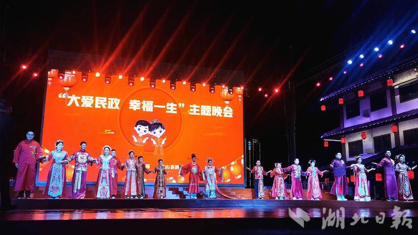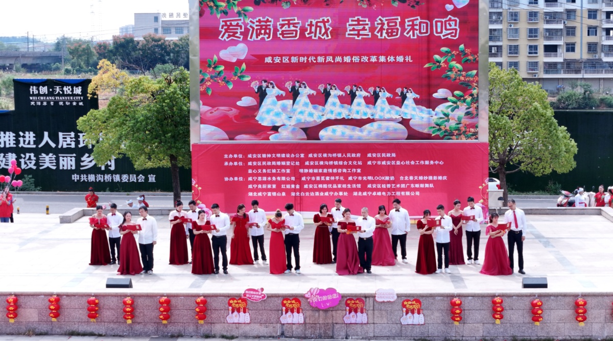10月3日,咸安区精神文明建设办公室联合横沟桥镇、区民政局举办的“爱满香城 幸福和鸣”集体婚礼暨相亲交友活动在横沟桥镇东站广场举行,吸引数百名群众围观参与。12对新人手牵手缓步走向舞台,婚礼仪式既庄重简约又浪漫甜蜜。(选自 湖北日报客户端咸安频道 作者 夏晖 王露 戴维丹)