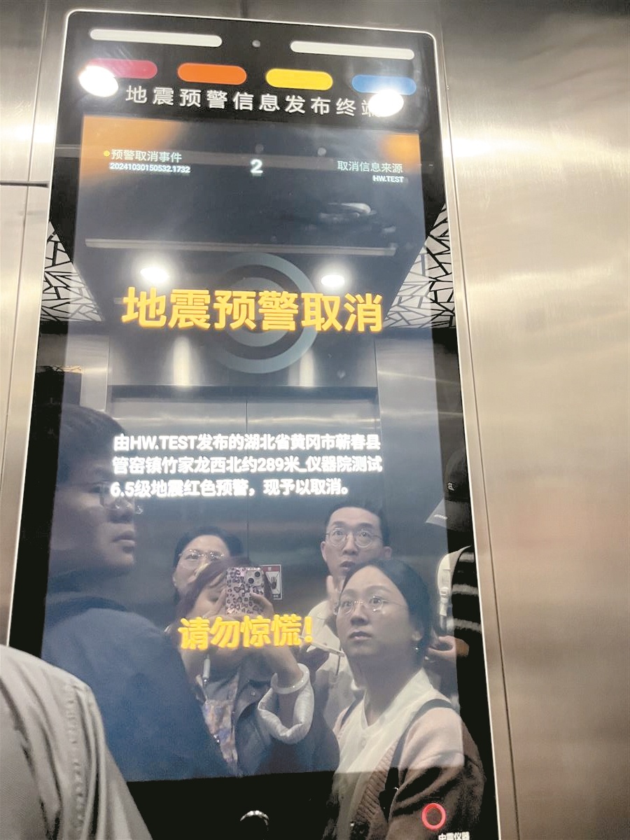 “滴滴滴滴,距离地震到达还有30秒。”位于武汉市武昌区湖北省地震局电梯内的一台地震预警信息发布终端发出报警声,终端屏幕提醒破坏性地震波即将抵达。此时正在进行地震预警测试,模拟武汉周边某地发生6.5级地震。