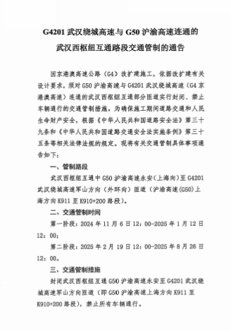 因G4京港澳高速公路改扩建施工,依据改扩建有关设计要求,须对G50沪渝高速与G4201武汉绕城高速(G4京港澳高速)连通的武汉西枢纽互通部分匝道实行封闭、禁止车辆通行的交通管制措施。为确保施工期间道路交通和人民生命财产安全,根据《中华人民共和国道路安全法》第三十九条和《中华人民共和国道路交通安全法实施条例》第三十五条等相关法律法规的规定,现将有关交通管制具体事项通告如下: