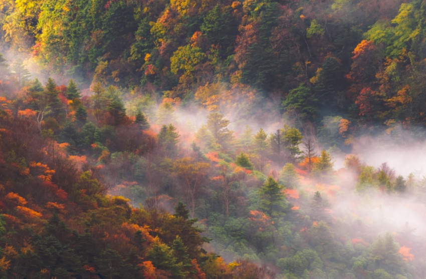 初遇云海,恍若仙境。随着脚步的深入,一片片绚烂的红叶林跃然眼前。北山的红叶,不似他处的单调,而是层林尽染,色彩斑斓。