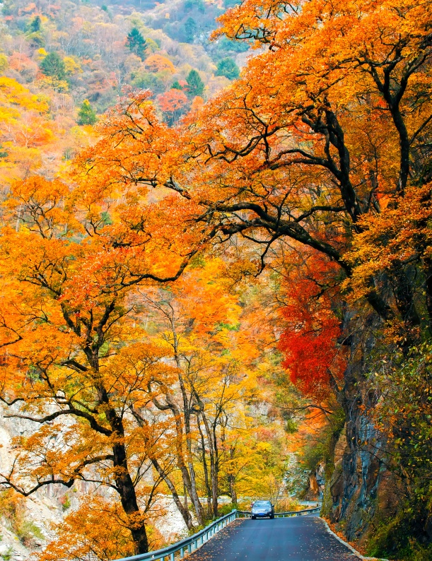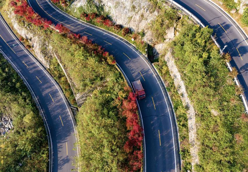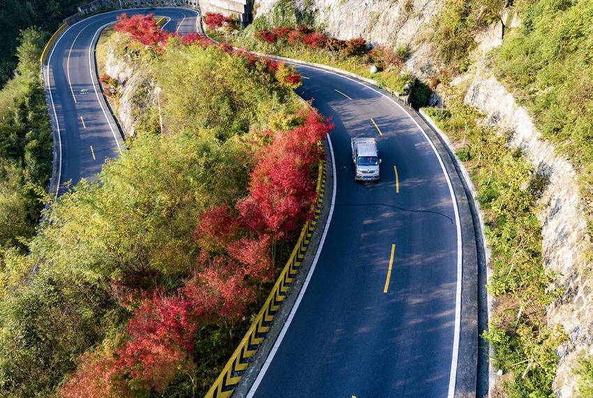 深秋时节,秭归县旅游公路“美丽宜道”芝茅路沿线红叶尽染,秋景如画,美不胜收。10月31日,车辆行驶在湖北省宜昌市秭归县“美丽宜道”芝茅路茅坪镇花果园段。