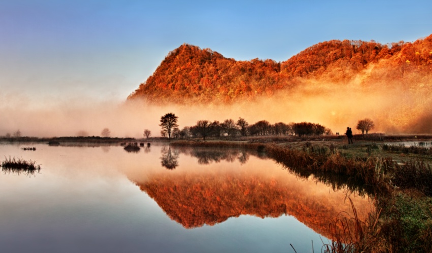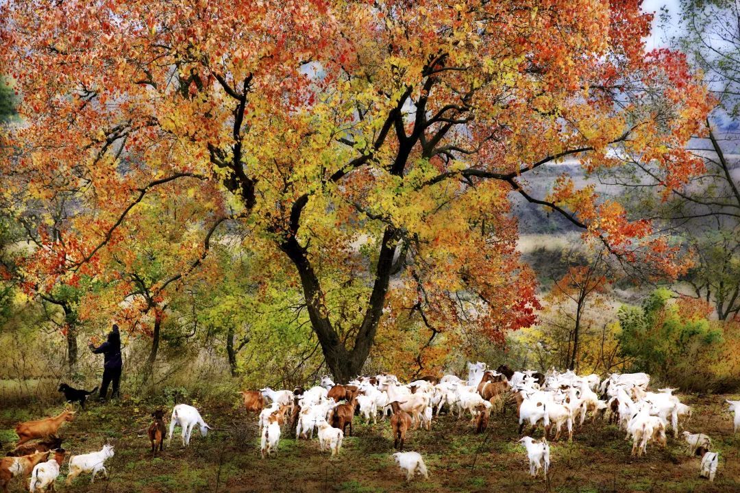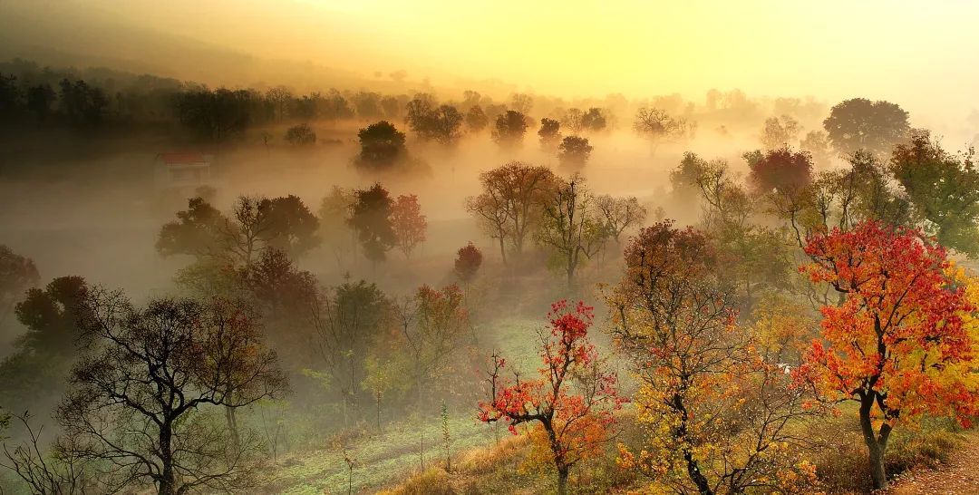 云雾中的风车、山间的洼地、晨雾下的乌桕、枝头间的喜鹊、山间的水牛、红叶下的日出,无论是哪一种混搭,都恰到好处。