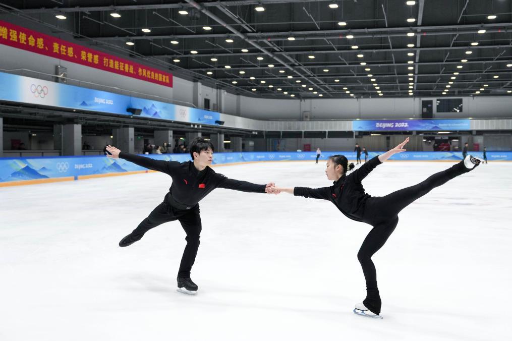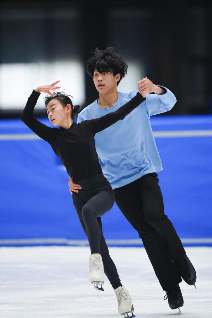 11月1日,青年双人滑组合张轩绮(左)和丰闻强在训练中。新华社记者 许雅楠 摄