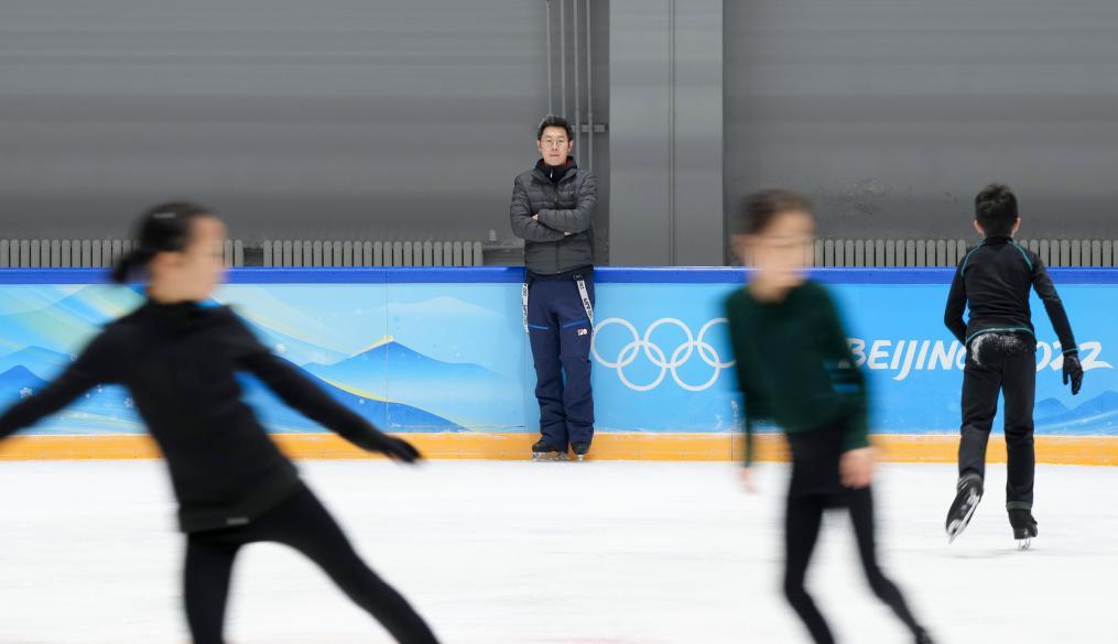 11月1日,双人滑教练员关金林(左二)观看运动员训练。当日,中国花样滑冰国家集训队在北京首都体育馆举行媒体开放日活动。新华社记者 许雅楠 摄
