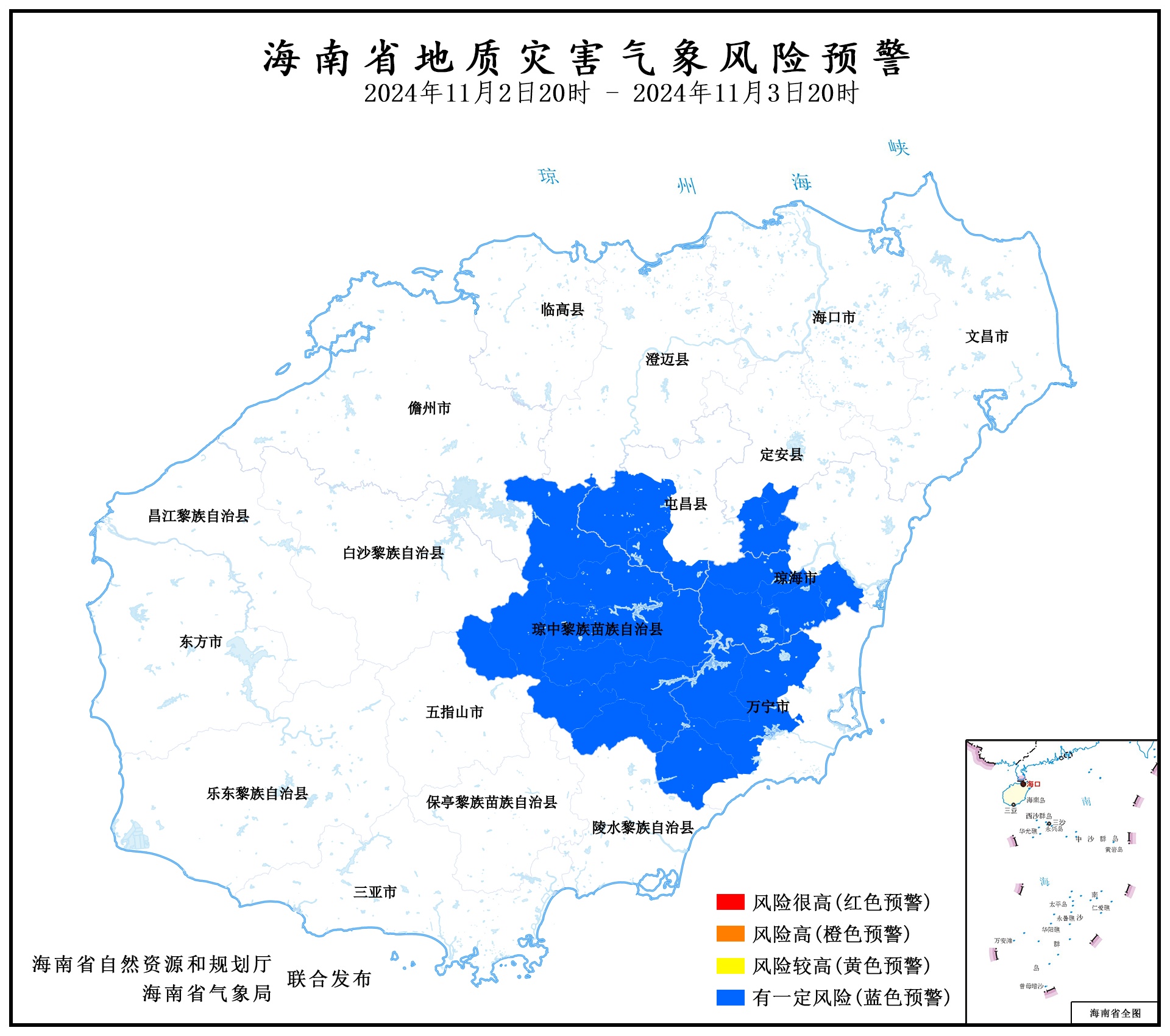 海南省自然资源和规划厅、海南省气象局2024年11月2日17时联合发布地质灾害气象风险预警:预计未来24小时(2024年11月2日20时至2024年11月3日20时)琼中县全境,琼海市石壁镇、中原镇、龙江镇、会山镇、阳江镇,万宁市三更罗镇、南桥镇、长丰镇、北大镇,定安县岭口镇、翰林镇,屯昌县乌坡镇、枫木镇、南坤镇降雨诱发地质灾害有一定风险,为Ⅳ级风险预警(蓝色预警)。
