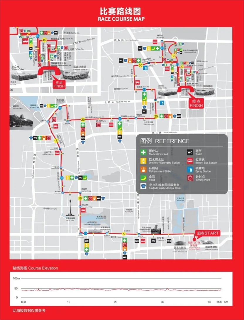 在比赛过程中,选手们将途经西长安街、西单商场、民族文化宫、军事博物馆、中华世纪坛等北京地标性建筑,最终抵达比赛终点——奥林匹克公园中心区景观大道,比赛路线全长42.195公里。为确保现场选手的顺利完赛,赛事组委会也在沿途设置了多个补给站和移动卫生间,并在起点和终点以及自赛道5公里起,至32.5公里,每隔2.5公里设置固定医疗站,自34公里,每隔1公里设置固定医疗站。同时,411名裁判员、6700名志愿者以及190辆物资运输车也将全程为赛事提供保障服务。