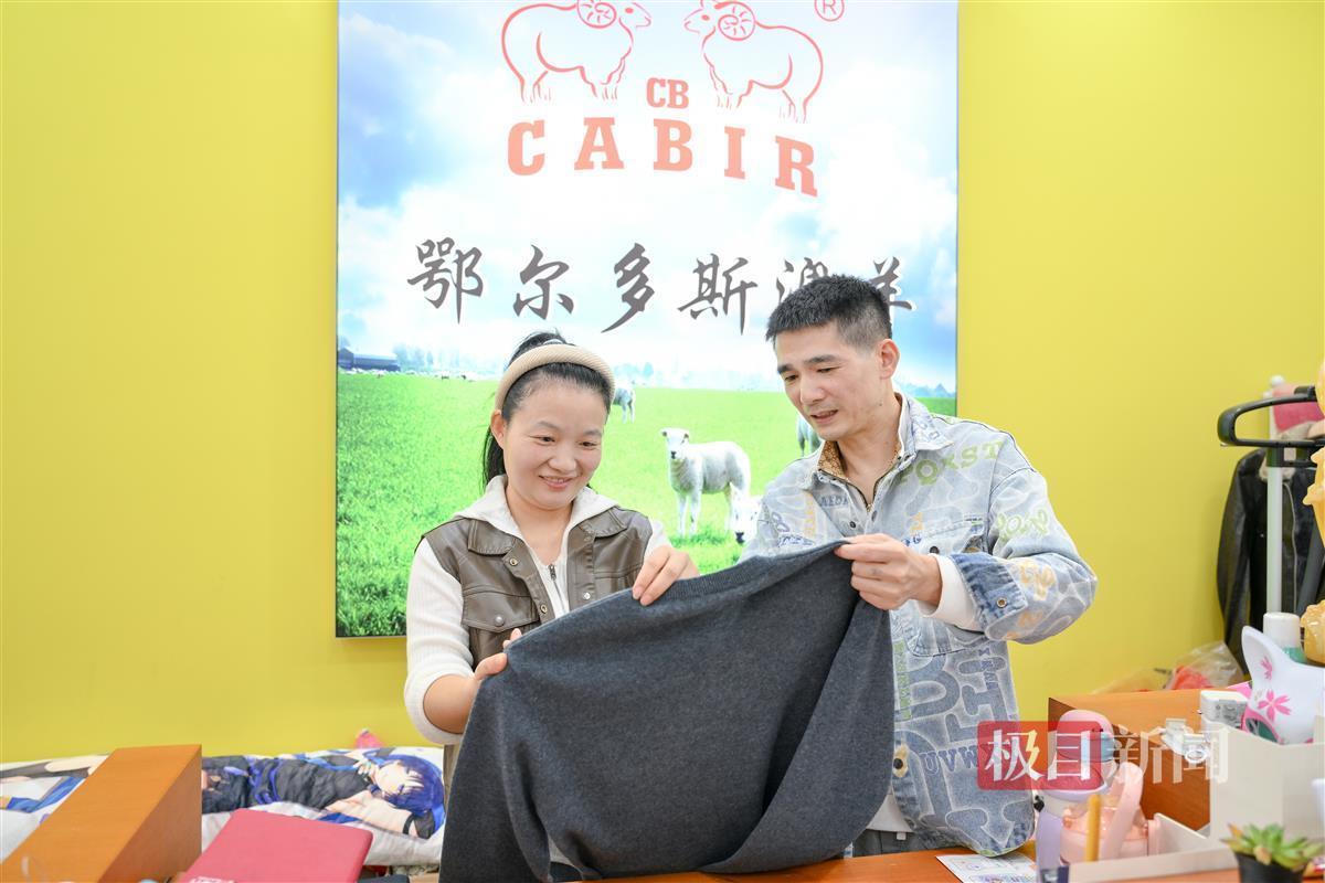 10月30日中午,极目新闻记者走进汉口北国际贸易城品牌服装城3楼,这里宽敞明亮,店铺鳞次栉比。一墙之隔的鄂尔多斯澳羊羊绒专卖店和羊绒生活体验馆毗邻而居,两家店内现在摆放的都是各种款式和颜色的羊绒服装,老板俞建良和妻子潘女士夫妇正在店内忙碌。