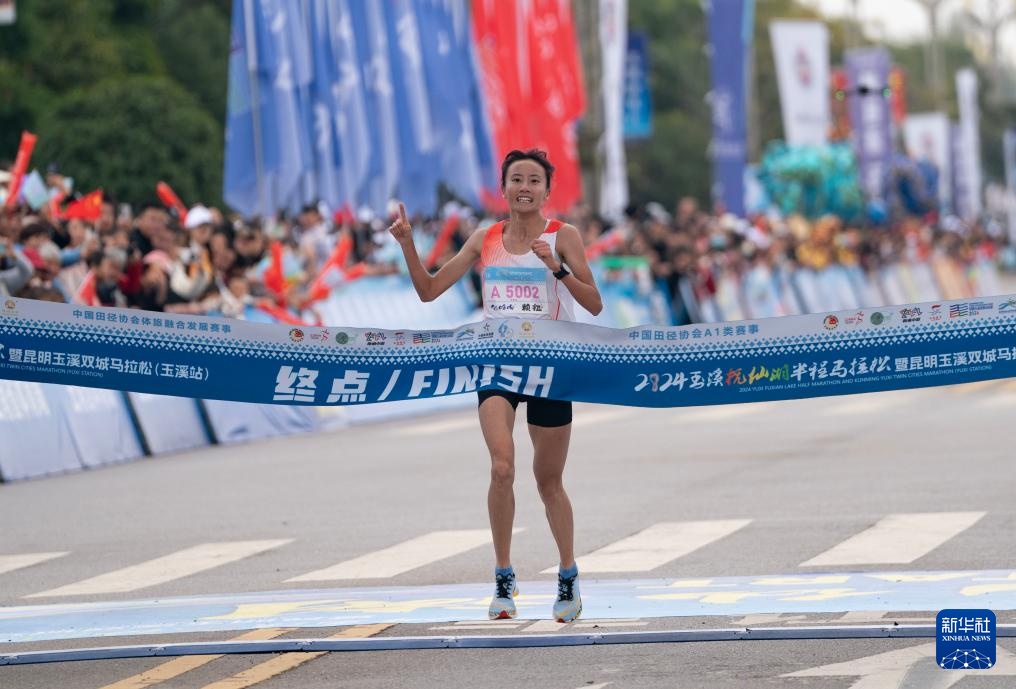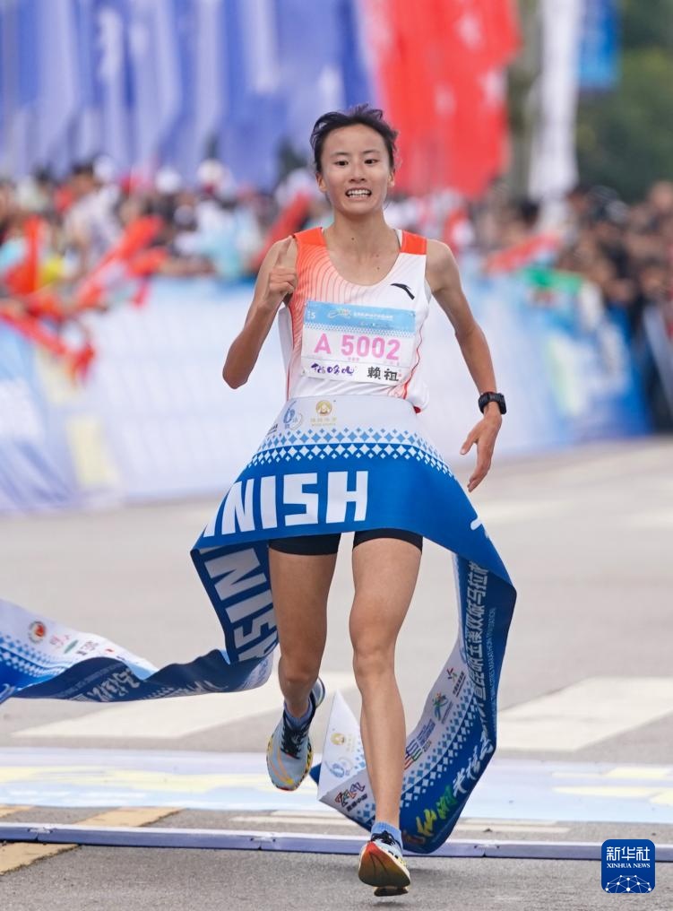 11月3日,选手李青青在比赛中冲过终点。最终,她获得半程马拉松女子组冠军。