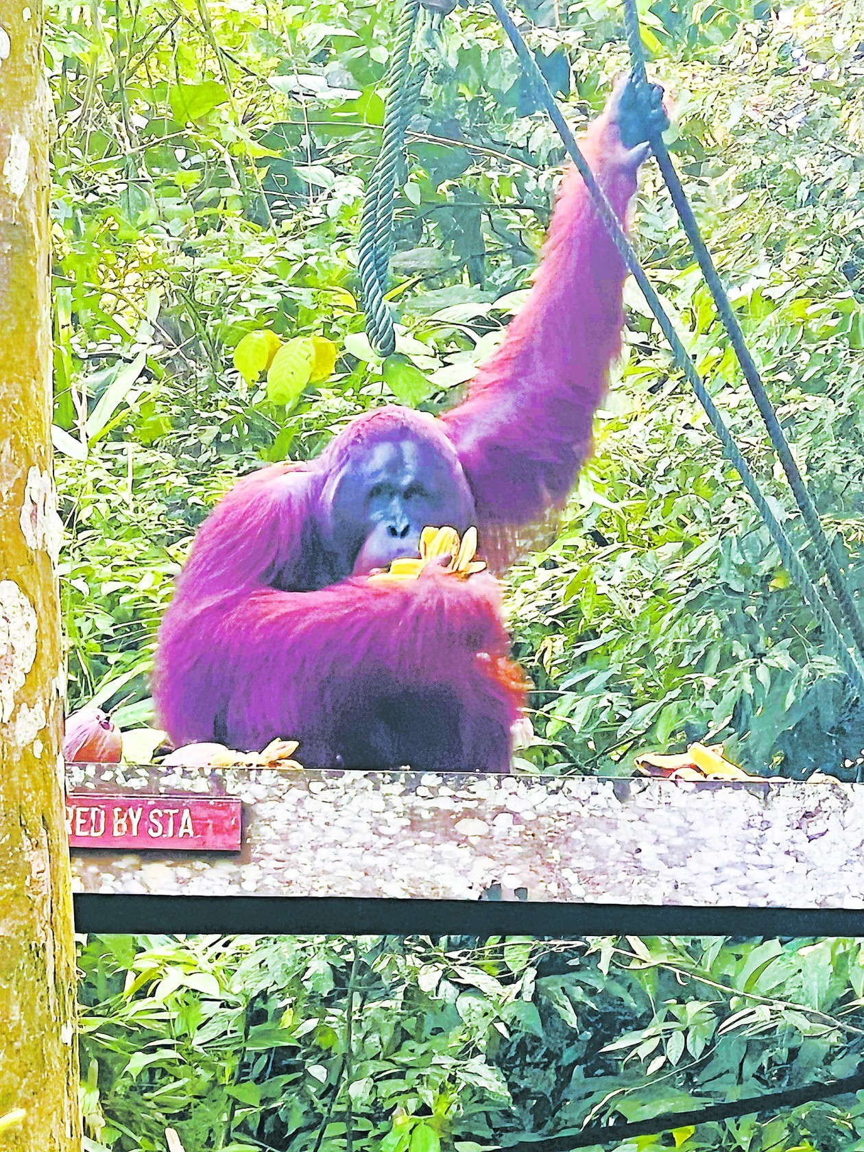 【环球时报特约记者 叶 满】马来西亚砂拉越丛林密布、河流环绕,这里是大型灵长类动物——红毛猩猩的家园。如果你想看到这种和人类共享97%DNA的动物是如何在树冠上荡秋千,或是如何破开坚硬椰壳一饮而足的,不妨从砂拉越首府古晋驱车前往实蒙谷野生动物护育中心,幸运的话,你能在护育中心的木质平台上欣赏到这种珍稀动物是如何进食的。