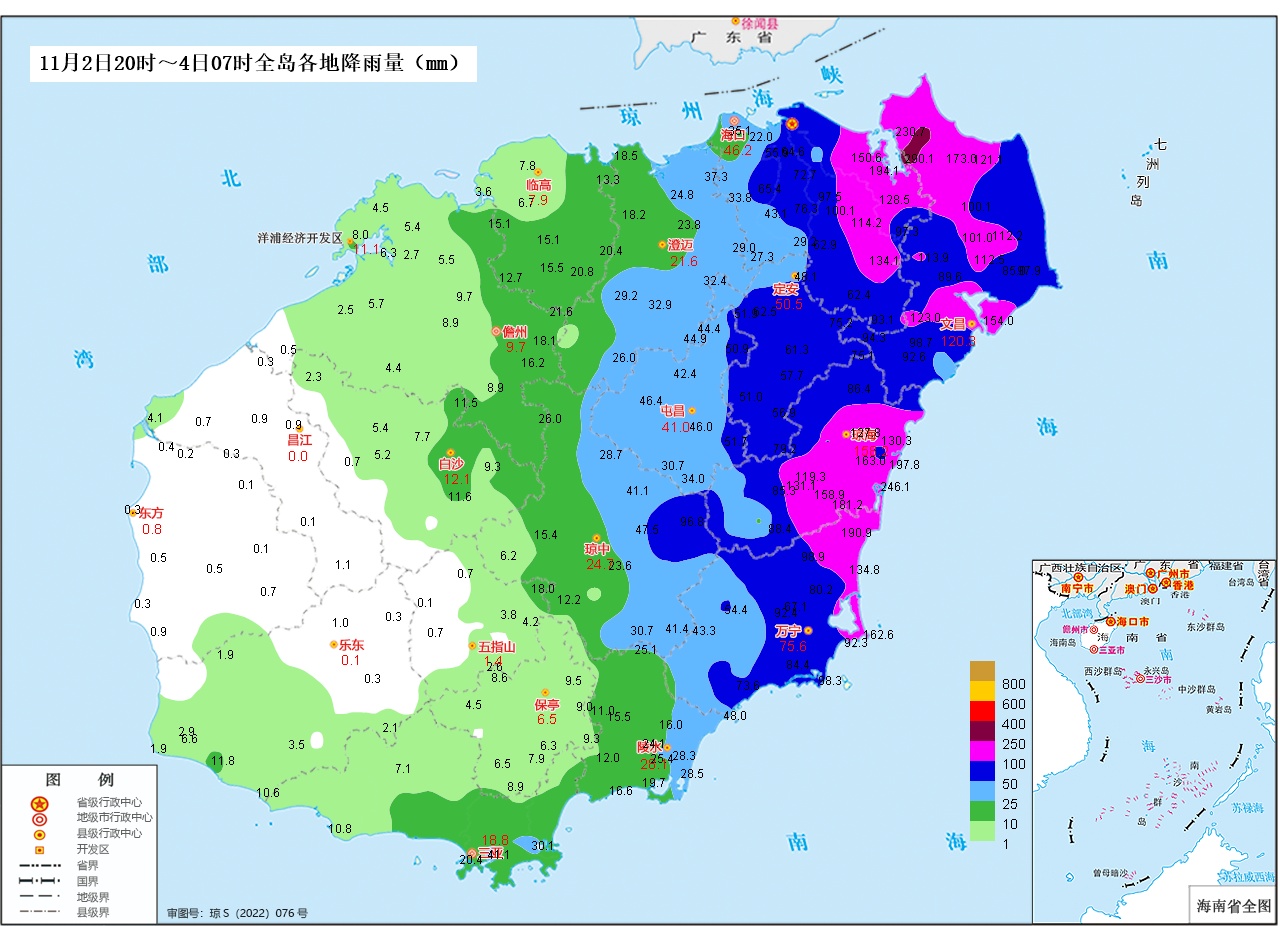 据统计,2日20时至4日07时,文昌、琼海、海口、万宁、琼中、定安和屯昌7个市县共74个乡镇(区)雨量超过50毫米,文昌、琼海、海口和万宁4个市县共31个乡镇(区)雨量超过100毫米,文昌和琼海两个市县共3个乡镇雨量超过200毫米,最大为文昌市锦山镇290.1毫米。