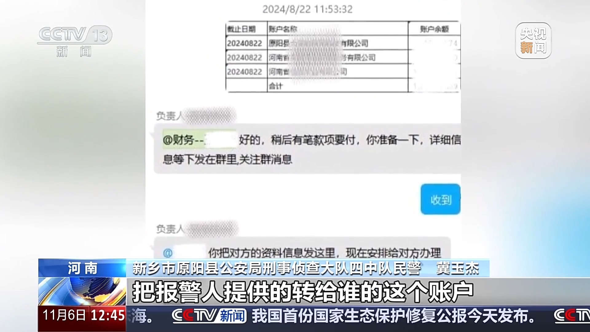 新乡市原阳县公安局刑事侦查大队副大队长 王峥:他主动给我们反诈中心打了个电话,为了让账户解封,他把这个钱给吞掉,然后他说他跟我们原阳这家被害企业是有业务往来关系。