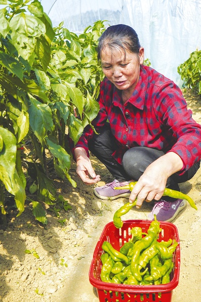 辣椒采摘季的到来,也带动了周边村民就近就业。村民续立芳已经是大棚里的“老员工”了,她熟练地采摘着辣椒,满脸带着笑容:“蔬菜基地建成以来,我就在大棚里上班,栽苗、打枝、除草、采收,全程参与,一天收入七八十元,还是很满意的。”