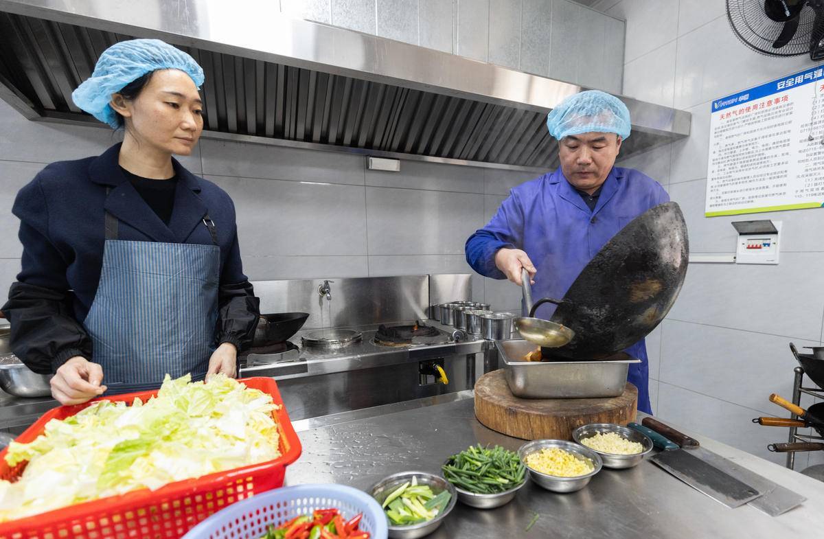 11月5日,四邑村幸福食堂厨师周大军(右)、赵文霞夫妇在忙着为老人做午饭。(湖北日报全媒记者 柯皓 摄)