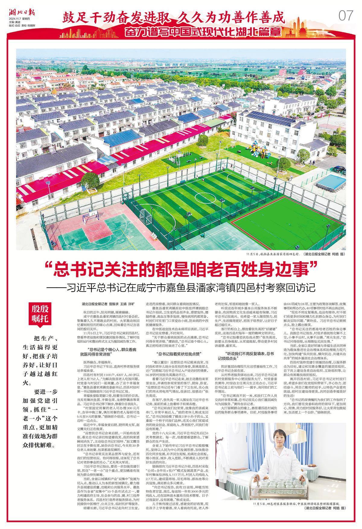 11月4日至6日,中共中央总书记、国家主席、中央军委主席习近平在湖北考察。这是5日上午,习近平在咸宁市嘉鱼县潘家湾镇四邑村养老服务驿站食堂考察。(新华社发)