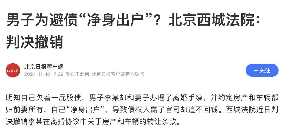 现实生活中,一些债务人为了逃避债务可谓是想尽各种办法,“净身出户”式的财产转移就是其中一种。所谓“净身出户”,就是为了逃避债务,在离婚时将房产和车辆等夫妻共同财产无偿转让给对方,且对方无需给他任何补偿,使自己名下没有可供执行的财产。这种“小聪明”,有着逃避债务的主观恶意,不仅违背了基本的诚信原则,也破坏了社会的公序良俗。