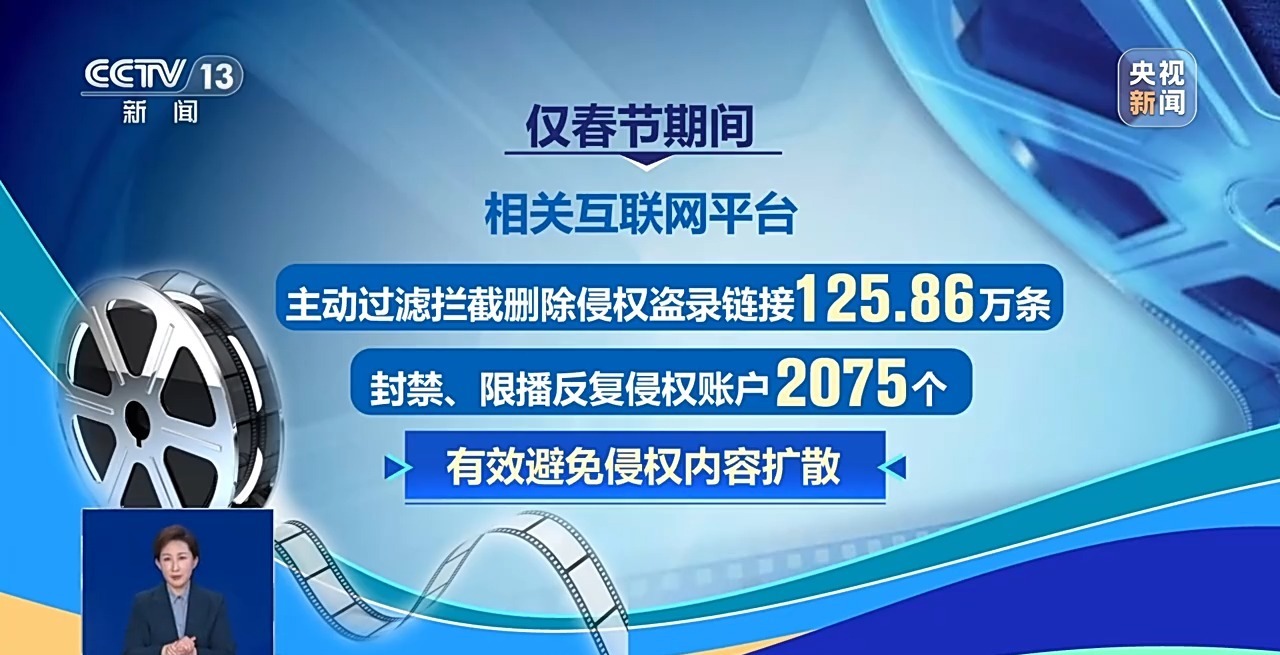 据统计,仅春节期间相关互联网平台处置监管部门转移、权利人投诉涉春节档院线电影侵权盗录链接6.45万条,主动过滤拦截删除侵权盗录链接125.86万条,封禁、限播反复侵权账户2075个,有效避免了侵权内容扩散。