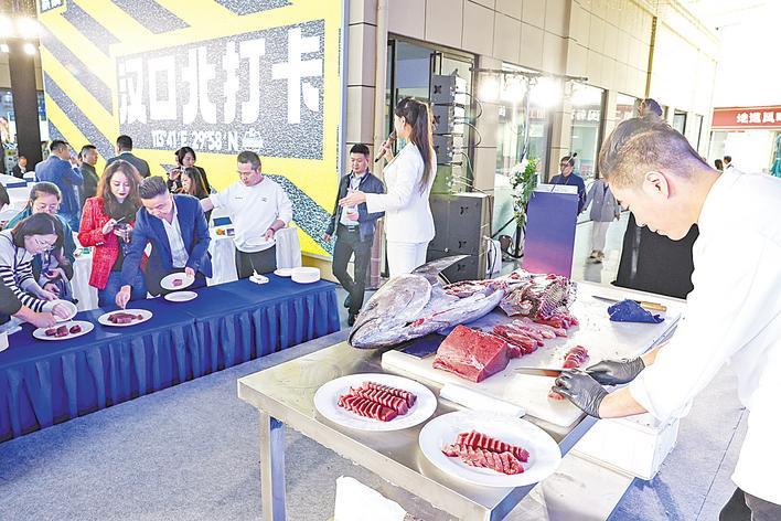 11月13日,由东南亚名厨现场烹饪的美食,吸引了不少市民排队拍照品尝。图为市民嘉宾现场品尝金枪鱼。 (湖北日报全媒记者 倪娜 通讯员 黄宣 刘春 摄)