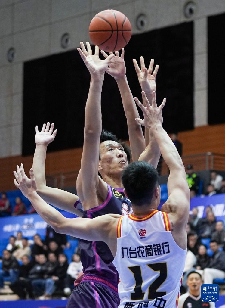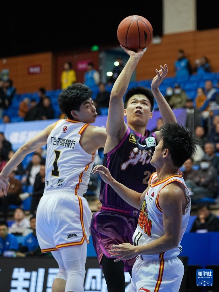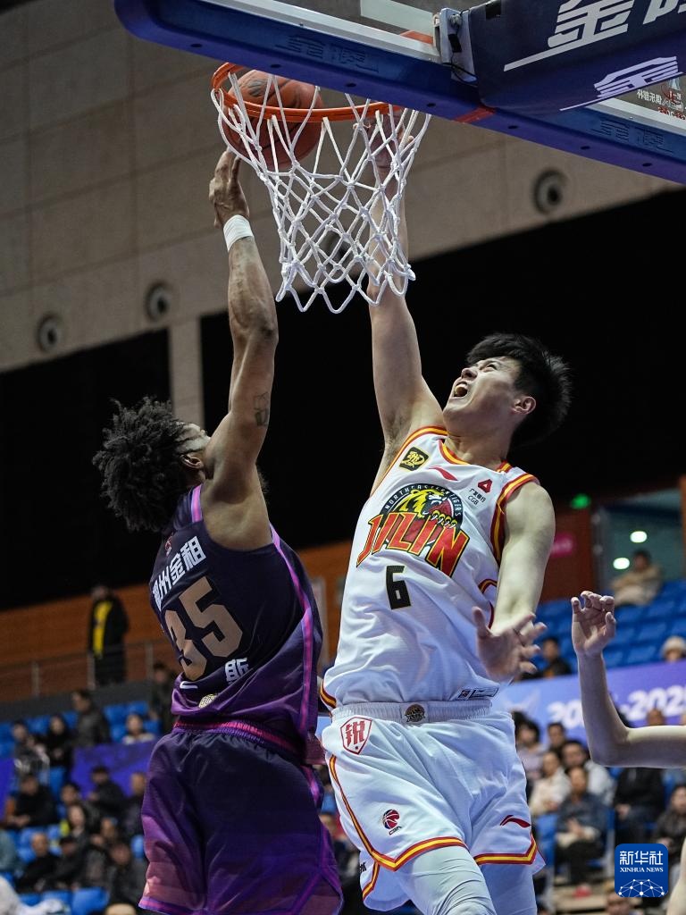 11月13日,吉林九台农商银行队球员赵嘉浩(右)在比赛中上篮。新华社记者 朱峥 摄