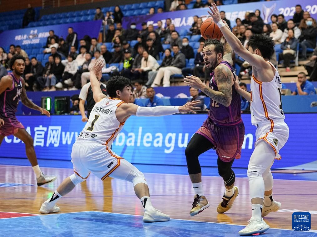 11月13日,浙江稠州金租队球员王仔路(中)在比赛中投篮。新华社记者 朱峥 摄