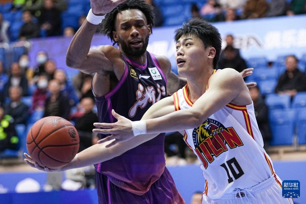 11月13日,吉林九台农商银行队球员姜伟泽(左)在比赛中带球突破。新华社记者 朱峥 摄