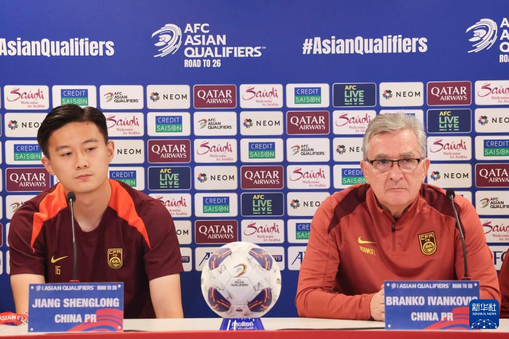 11月13日,中国队主教练伊万科维奇(右)和球员蒋圣龙出席新闻发布会。新华社记者 王海洲 摄