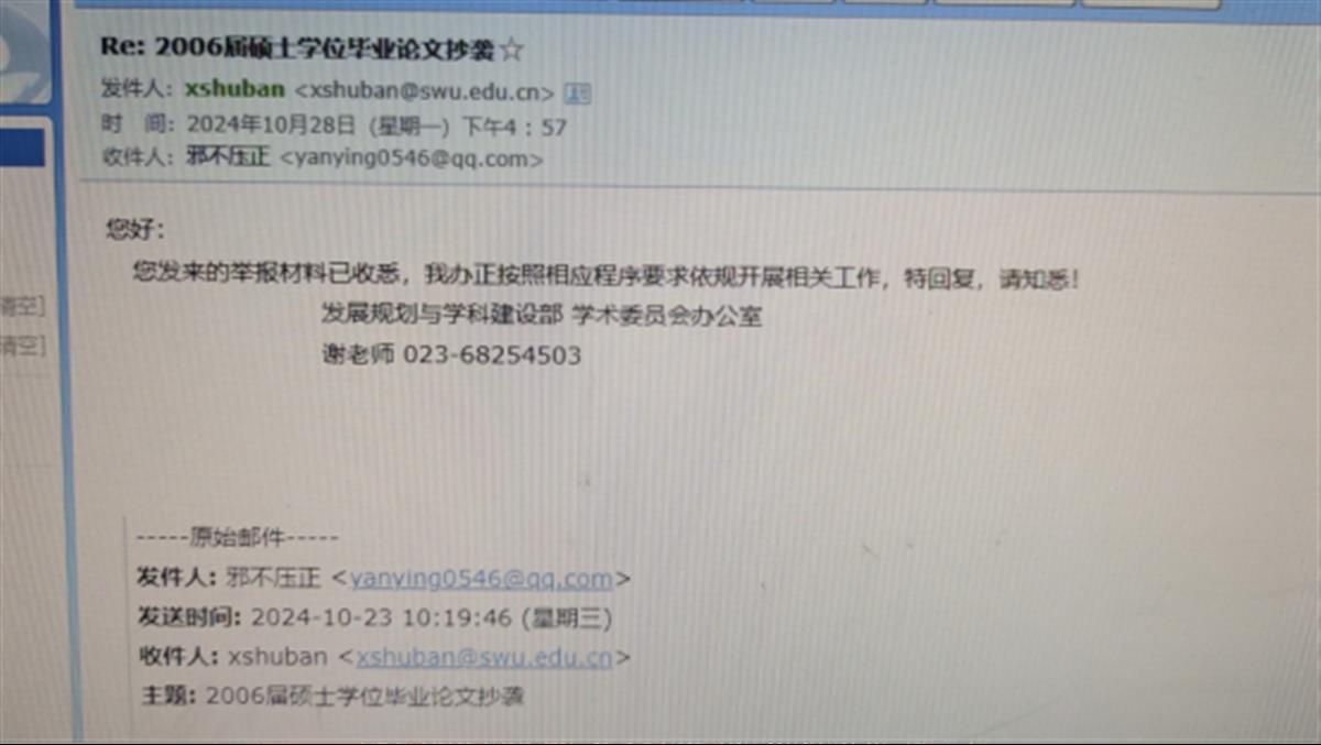 吕屹向西南大学学术委员会提交了上述举报材料,她提供的邮件显示,10月23日,西南大学发展规划与学科建设部学术委员会办公室工作人员回应称:“您发来的举报材料已收悉,我办正按照相应程序要求依规开展相关工作。”