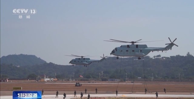 总台央视记者 何椿:在海军陆战队在此次航展的一个起飞区,航展期间队员们就是从这里搭载直-20J舰载直升机和直-8C运输直升机前往展区进行空中展示。