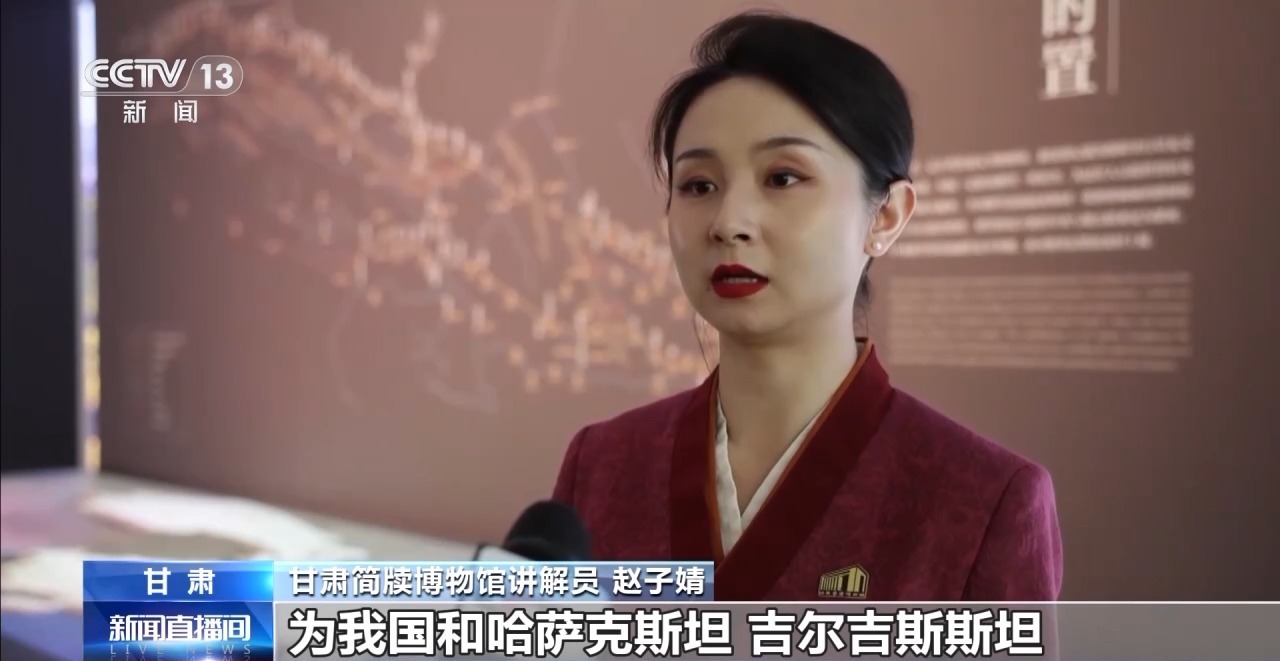甘肃简牍博物馆讲解员 赵子婧:刚好两枚里程简的路线接力勾勒出古丝绸之路的东段路线,为我们揭秘了2000多年前丝绸之路的真实走向。在第三十八届世界遗产大会上,为我国和哈萨克斯坦、吉尔吉斯斯坦三国联合申遗的“丝绸之路:长安——天山廊道的路网”项目,也入选了世界遗产名录,提供了真实有效的历史依据。