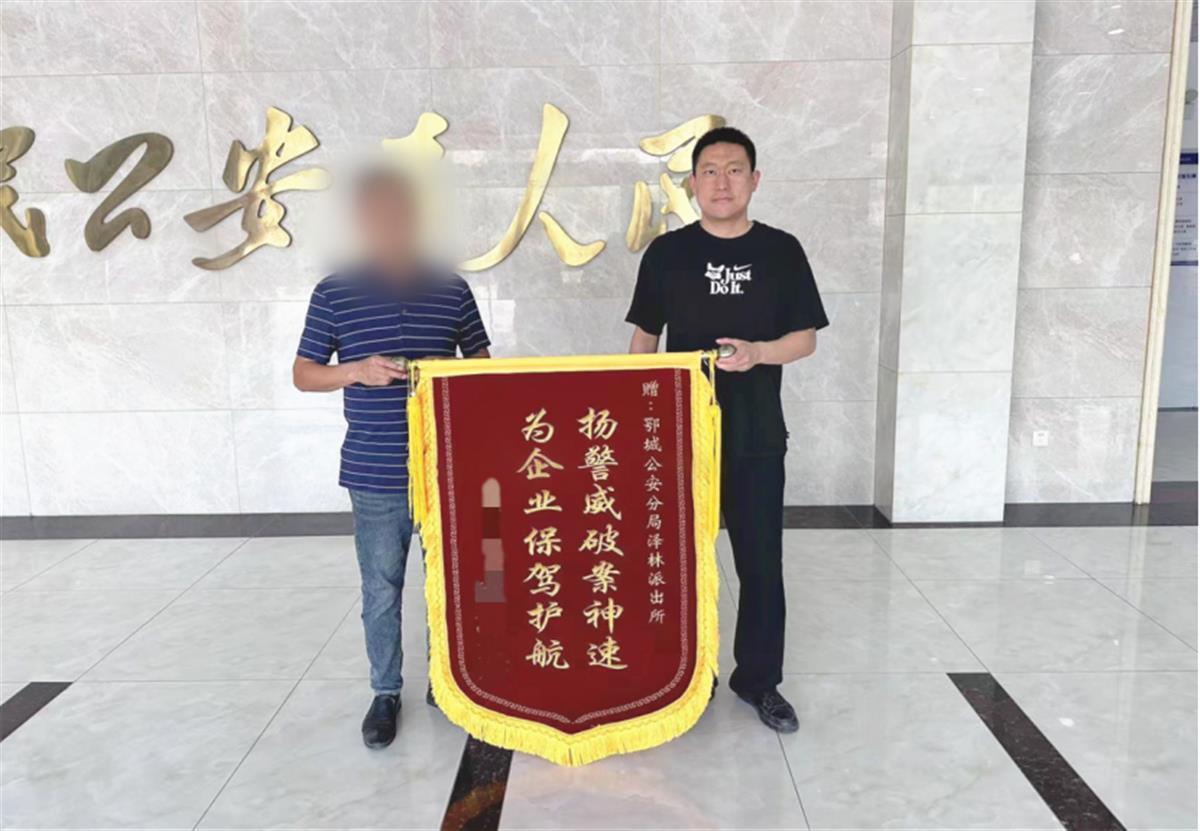 通过深挖追踪,泽林派出所民警根据相关规定,于10月28日赴外省解冻资金,并将该案帮信嫌疑人万某抓获归案,核实相关情况后,民警联合银行工作人员将50万资金返还至张某公司公款账户。为表达感激之情,张某将一面印有“扬警威破案神速,为企业保驾护航”的锦旗送到泽林派出所。