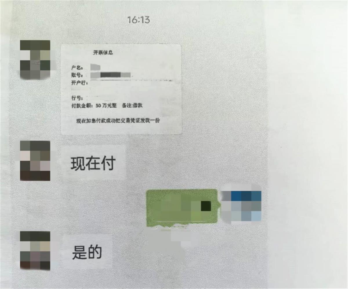 事情回到今年6月29日,在某公司上班的财务人员孙女士收到“老板”发来的微信信息称,“现在加急付款,成功后把交易凭证发我一份”,并详细告知了收款方的姓名、银行账号、开户行地址、行号、付款金额(50万元整)等信息。