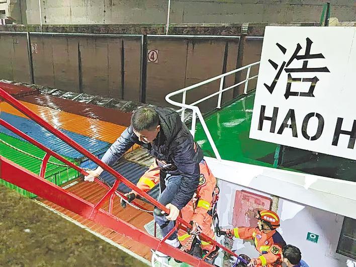 “船长情况怎么样?不要着急,我们现在就搭梯过去救他上岸。”在护航平台执勤的宜昌市消防救援支队三峡坝区特勤大队一站站长董畅向“浩航1005”货船喊话。战斗班长陈源鑫赶紧目测货船甲板到护航平台护栏的距离,随着江水注入,“浩航1005”货船从二十多米的闸底逐步抬升,15分钟后,水位达到离护栏五六米处。“赶紧架梯。”陈源鑫下令。朱健携带5.6米长的多功能救援梯,从护栏往船上架设,搭起一条“生命通道”。
