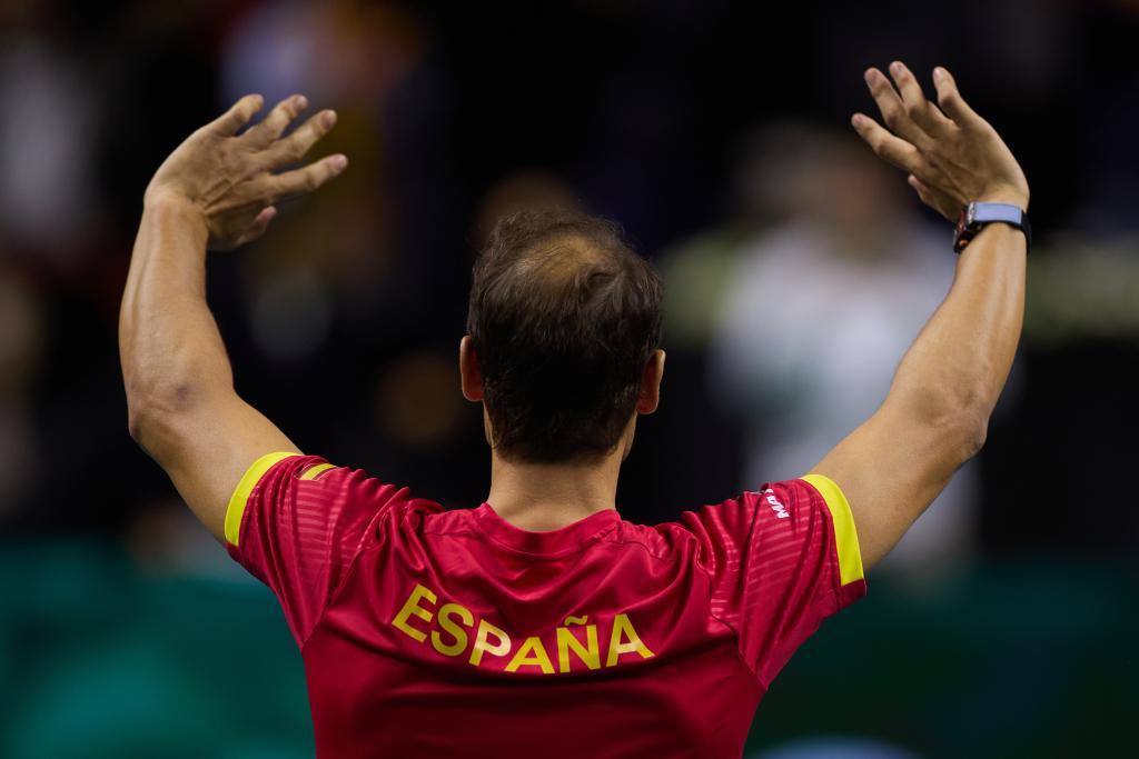 11月19日,西班牙队选手纳达尔(右)在比赛间隙拥抱队友阿尔卡拉斯。新华社记者 孟鼎博 摄