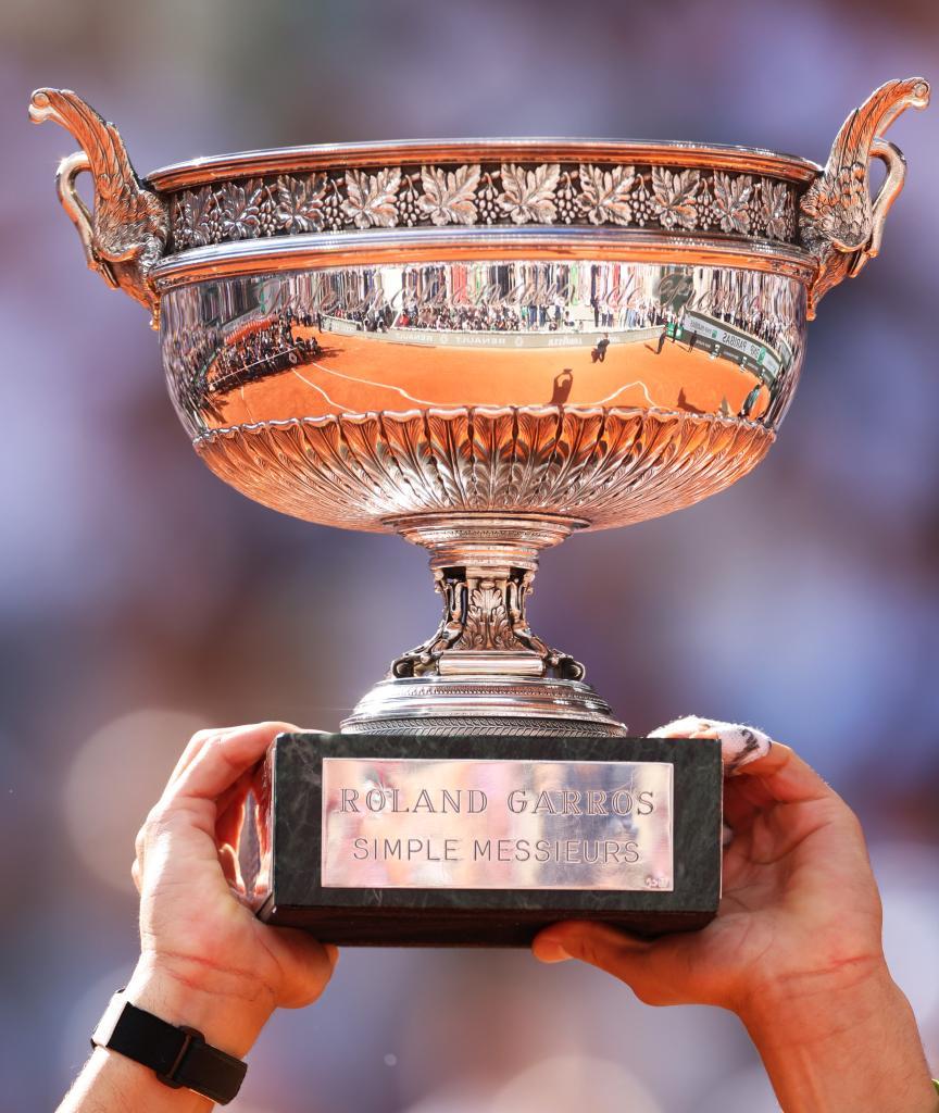 2022年6月5日,纳达尔在颁奖仪式上举起冠军奖杯。在巴黎进行的2022法国网球公开赛男子单打决赛中,西班牙选手纳达尔以3:0战胜挪威选手鲁德,获得冠军。新华社记者 高静 摄