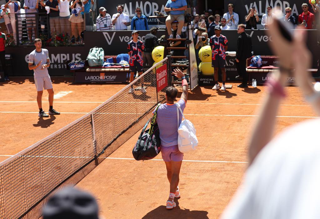 2024年5月11日,纳达尔赛后向观众致意。当日,在ATP1000罗马大师赛男子单打第二轮比赛中,西班牙选手纳达尔0:2不敌波兰选手胡尔卡奇,无缘晋级。新华社记者 李京 摄