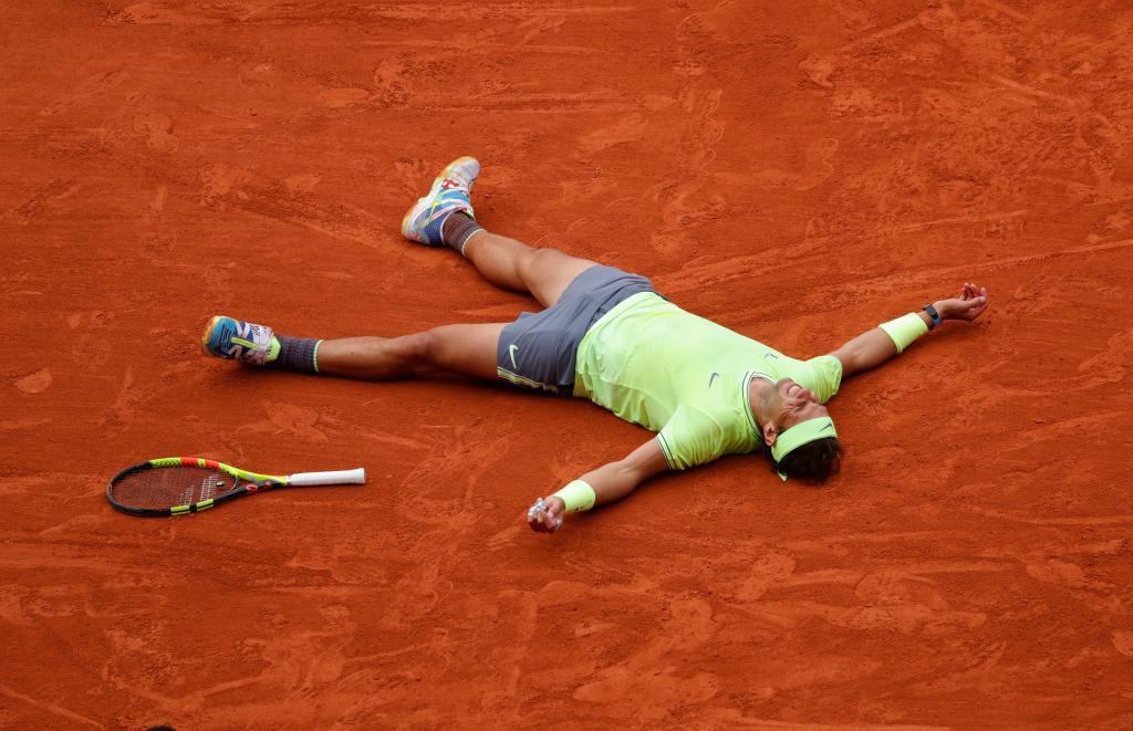 2019年6月9日,纳达尔在法国网球公开赛男单决赛获胜后倒地庆祝。新华社记者 韩岩 摄
