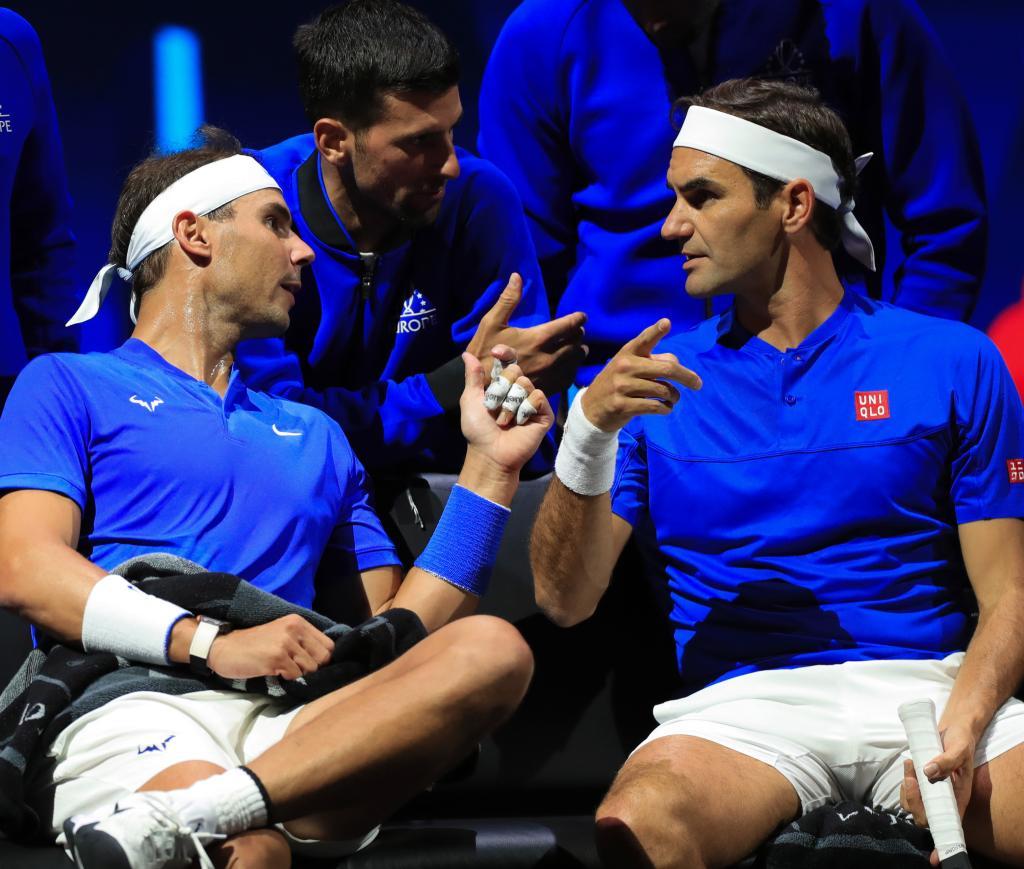 2022年9月23日晚,在伦敦举行的拉沃尔杯网球赛上,欧洲队费德勒(前右)、纳达尔(前左)与焦科维奇在比赛间隙交谈。新华社记者 李颖 摄