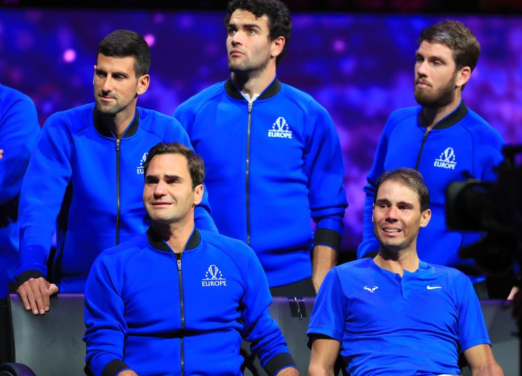 2022年9月24日凌晨,费德勒(前左)与纳达尔(前右)在赛后告别仪式上落泪。9月23日晚,瑞士网球选手费德勒在伦敦举行的拉沃尔杯网球赛上完成职业生涯最后一场比赛,正式退役。新华社记者 李颖 摄