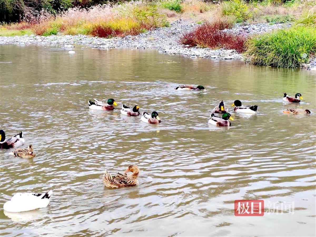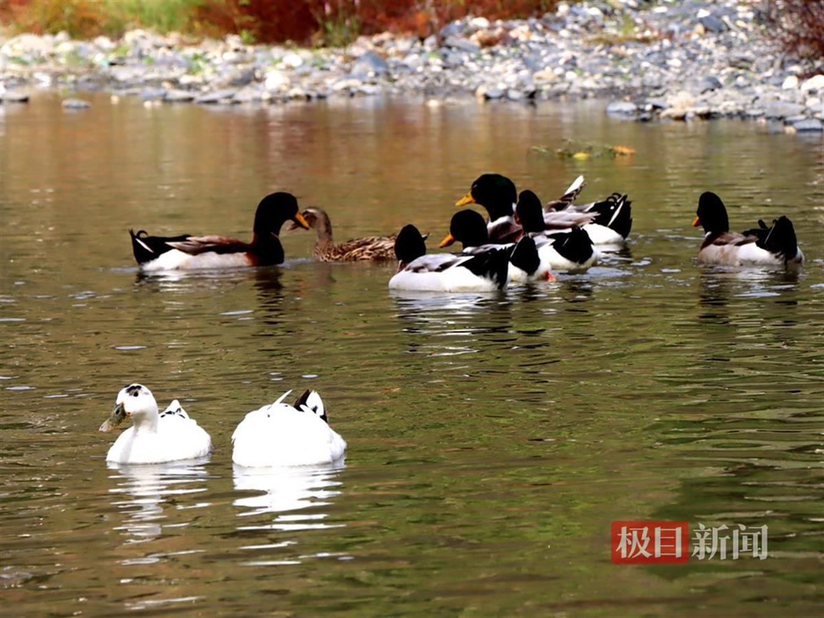 11月20日,湖北省竹山县竹坪乡宽坪村河道中,出现了几只白鹭与鸭子、白鹅共叙友情的和谐画面。