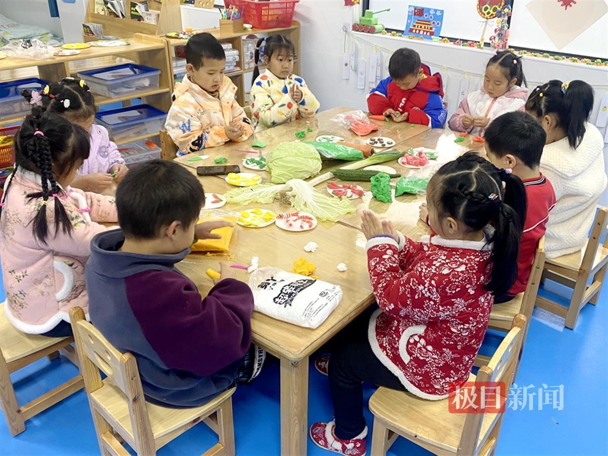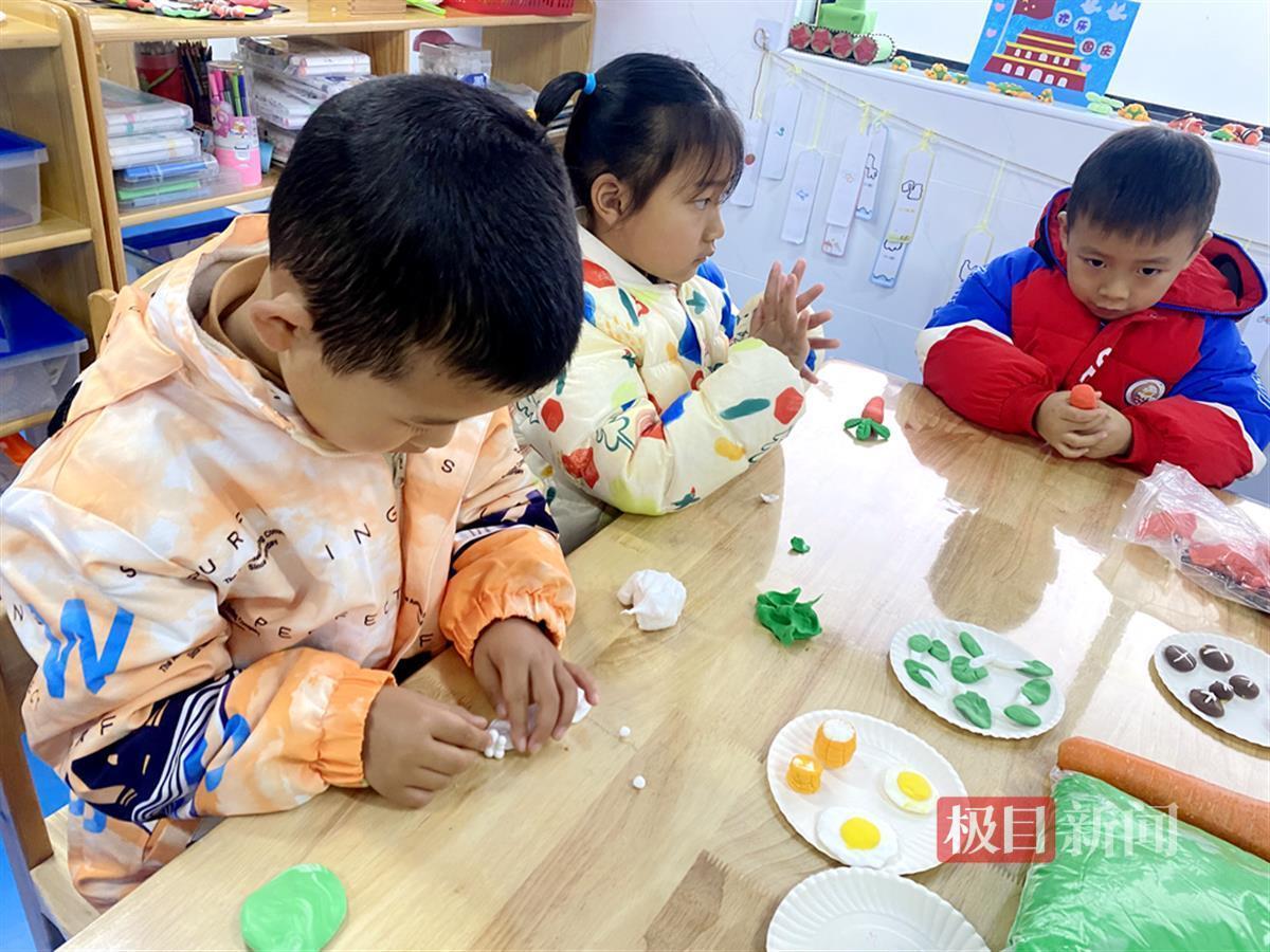 11月20日,湖北十堰竹山县竹坪乡中心幼儿园的小朋友们,开展“美味火锅”手工制作活动,在玩中学习食品安全与营养均衡知识。