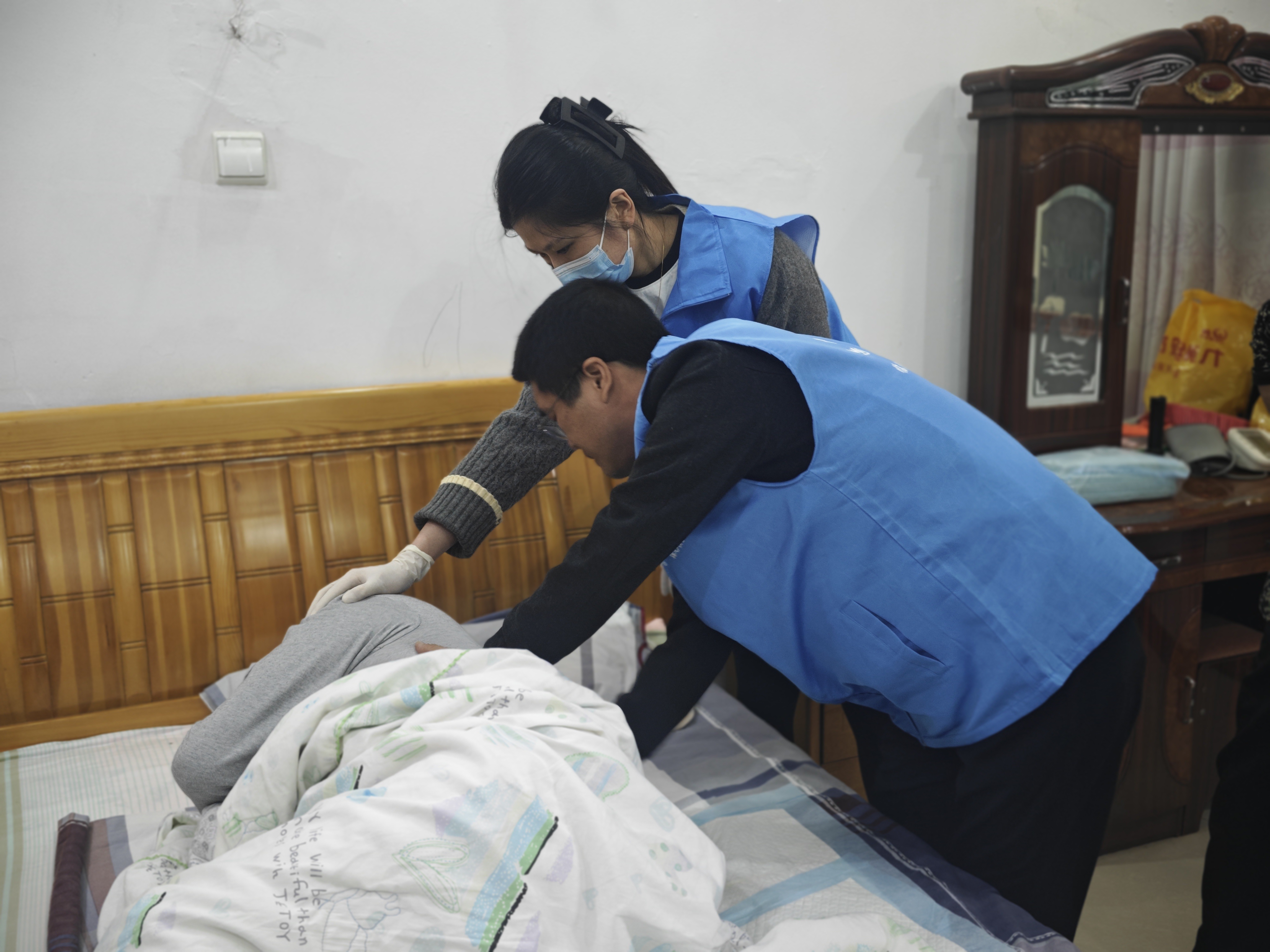 “翻身的时候,要顺势给他按按腿。”毛广超一边给长期卧床、不能自理的王济生翻身,一边向王济生的老伴讲授一些日常护理的技巧。