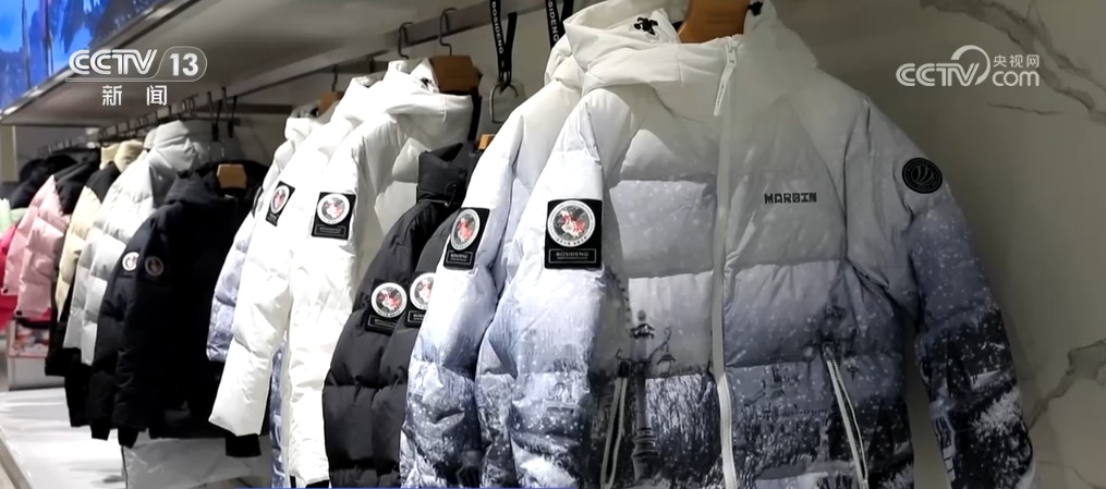在哈尔滨的这个商场,“尔滨”联名款的羽绒服设计让不少消费者眼前一亮。除了醒目的“尔滨”二字外,还包括松花江元素和黑龙江地形图,并巧妙地将哈尔滨的城市风貌融入其中。巧思妙想的设计在俘获消费者的同时,也让当地政府看到了一些机遇。