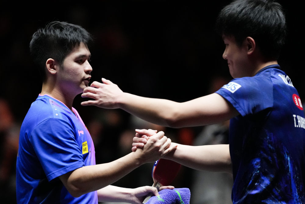 11月23日,林诗栋(左)在比赛后与张本智和握手。新华社记者 张笑宇 摄