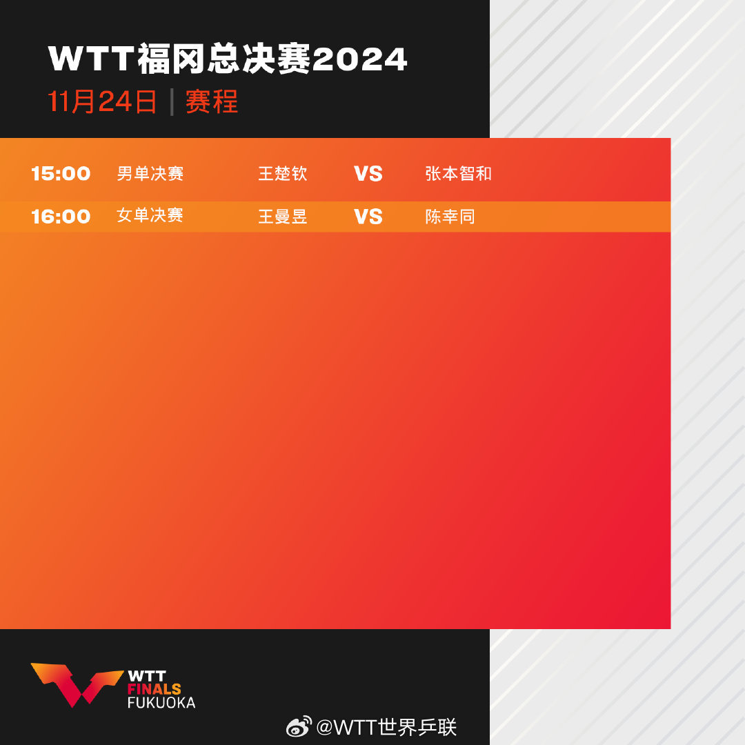 据@WTT世界乒联 消息,WTT福冈总决赛2024今日迎来男女单打决赛,下午3点男单决赛王楚钦VS张本智和,下午4点女单决赛王曼昱VS陈幸同。