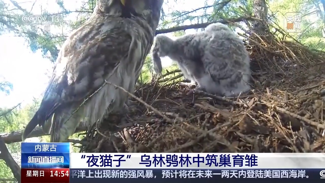 画面中,一只鸮宝宝在鸮妈妈的身子底下观察周围,它们的巢穴宽敞平坦。我们在不打扰它们生活的前提下,近距离拍摄观察到乌林鸮在树上的筑巢。