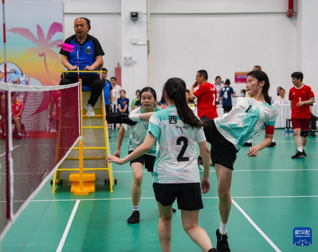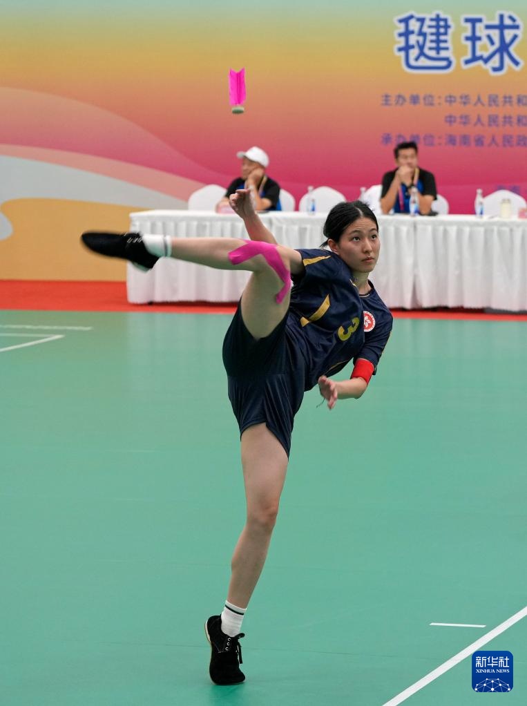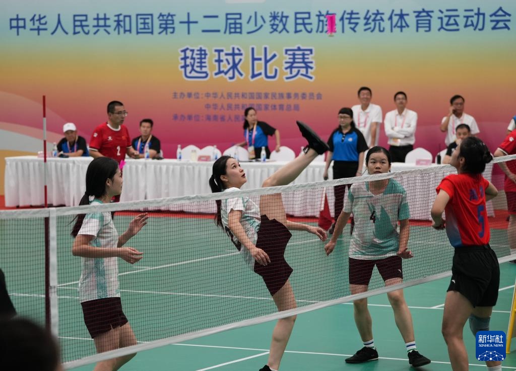 当日,第十二届全国少数民族传统体育运动会毽球女子三人小组赛在海南省三亚市举行。