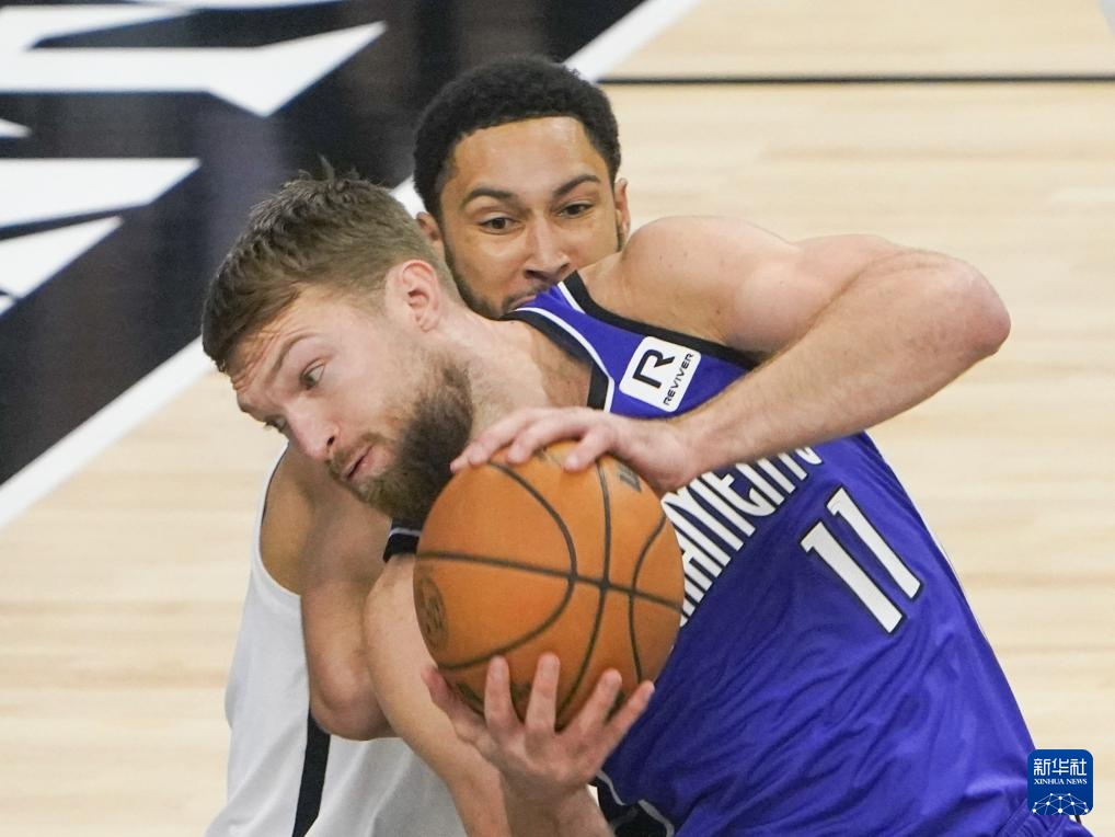 11月24日,国王队球员萨博尼斯(前)与篮网队球员西蒙斯在比赛中拼抢。