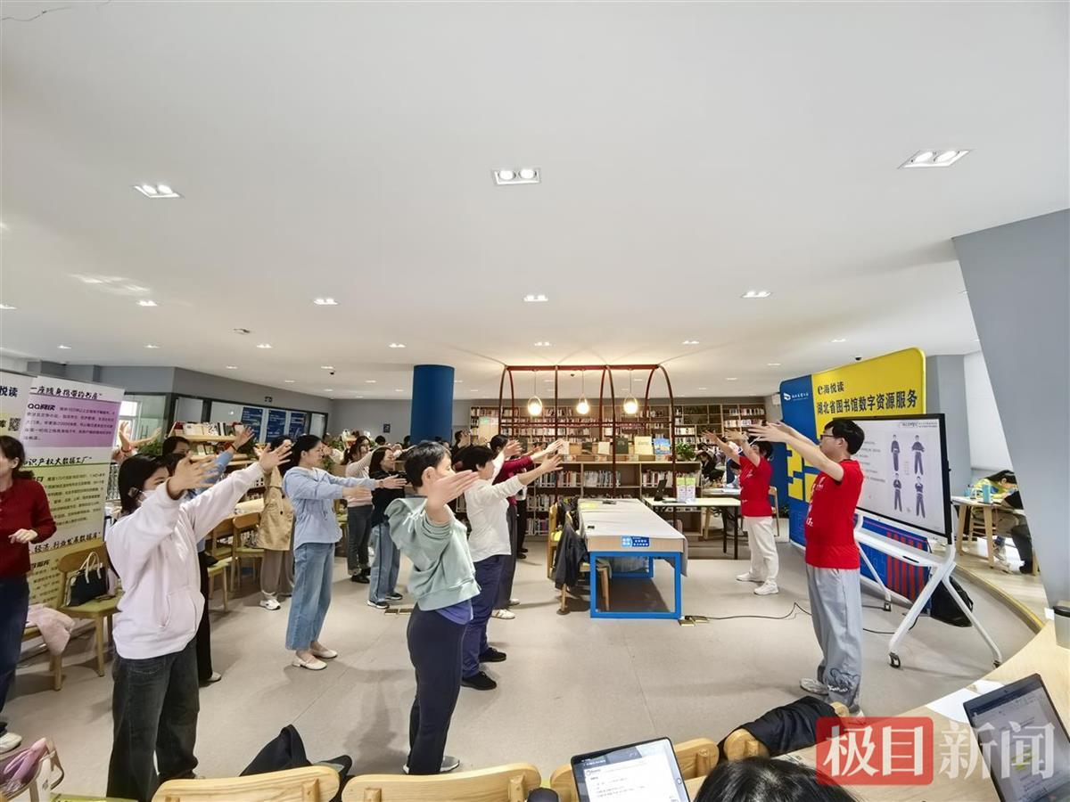 在光谷书房·大学科技园分馆,湖北省中医院针灸科主任医师韦丹教授,为现场读者详细讲解并示范“股本易筋经十二势导引法”——“双手上举,掌心向上,如托天之势,拉伸全身,注意配合呼吸,这个动作叫‘托天理三焦’,能够帮助我们缓解肩颈僵硬。”体验者们纷纷表示,每个动作都有其特定的疏导经筋和濡养脏腑的效果,让他们在忙碌的生活中找到了一种放松身心的方式。