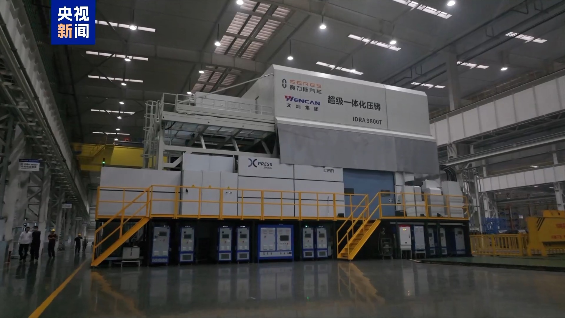 再穿过一道门,眼前的景象又让我们大吃一惊。四台全球最大的两板式压铸机正将一件件铝合金车身部件压铸成型。