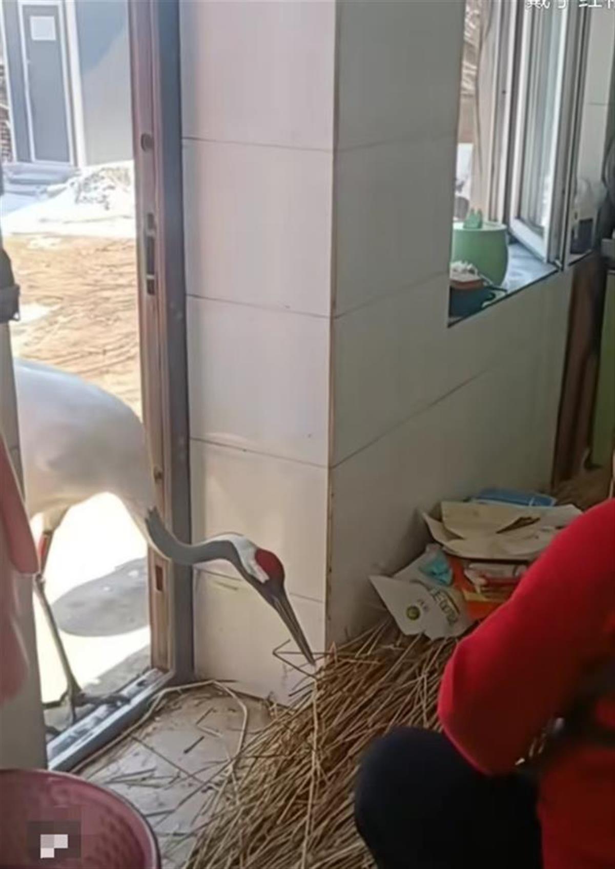 视频显示,一只丹顶鹤闯入村民家中,该村民正在家中准备“做鱼”。被村民阻拦后,丹顶鹤退出房子。该视频在网络上引发关注和讨论。