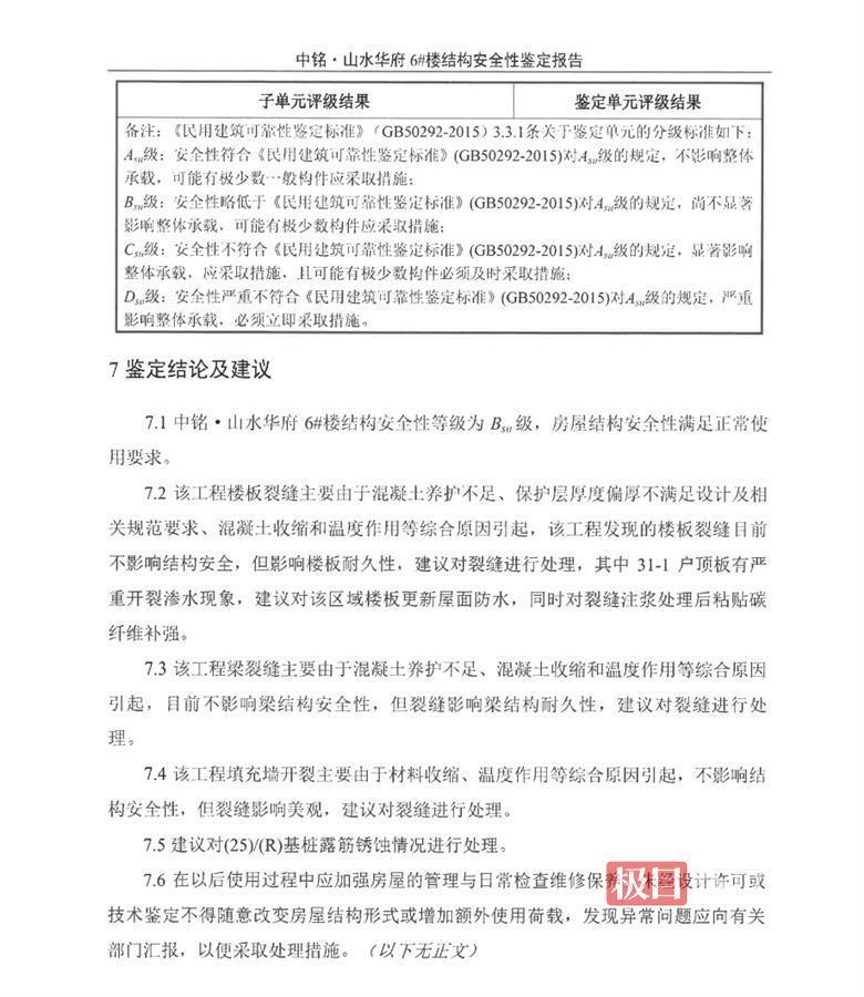 该鉴定报告结论还称,中铭山水华府6#楼结构安全性等级为Bsu级,房屋结构安全性满足正常使用要求。根据公开资料显示,Bsu级的含义是,安全性略低于《民用建筑可靠性鉴定标准》(GB50292—2015)对Asu级的规定,尚不显著影响整体承载,可能有极少数构件应采取措施。